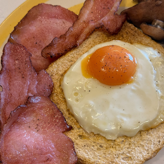 Fry Up Plate - Brown Plate, 1 x egg, rustic toast, mushroom, sausage, bacon 😋