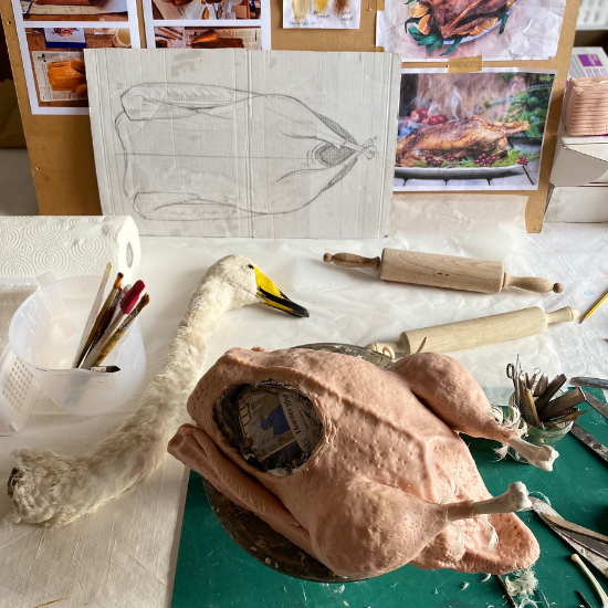 “A lot of my skills were developed through hands-on practice. My first professional role was as Artist in Residence for the Vindolanda Trust on Hadrian’s Wall, where I carved Roman altar stones and painted frescoes. Taxidermy is another form of replication—endeavouring to mimic life in its most still form. Sculpting food allows me to capture that same level of detail and bring a sense of history to life.”