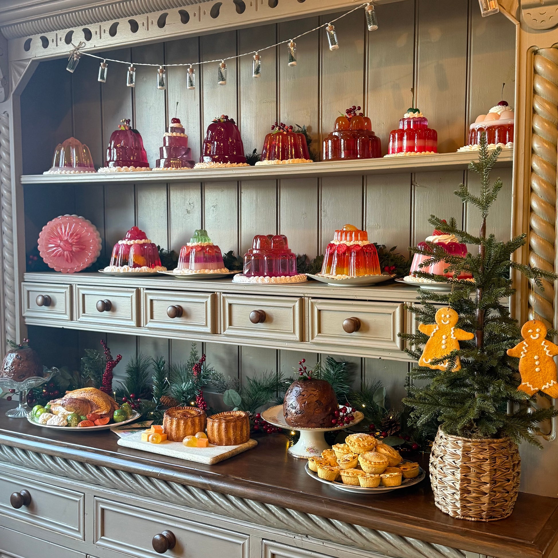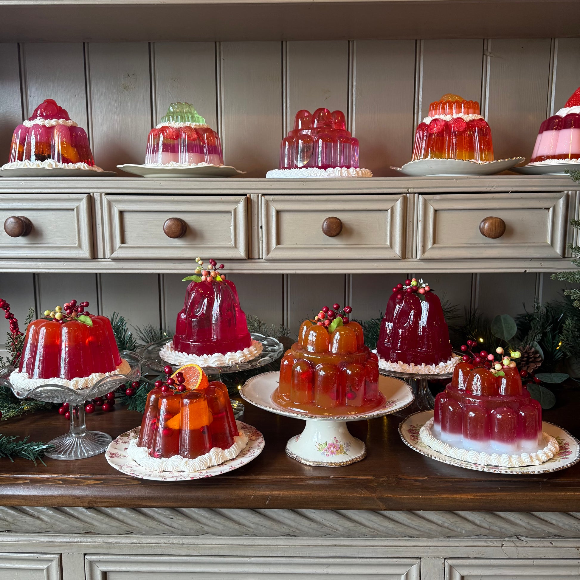 Each jelly is designed as a showpiece for tables, counters, festive scenes and display cabinets, bringing colour and height without the challenges of using real food. These pieces are part of our heritage-inspired collection, drawing on historic dessert moulds and the theatrical presentation of period dining.