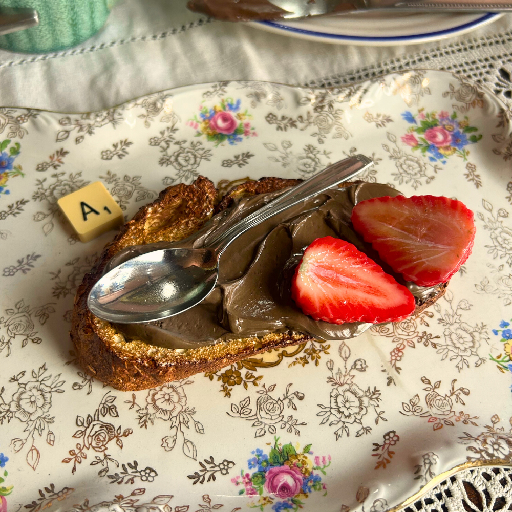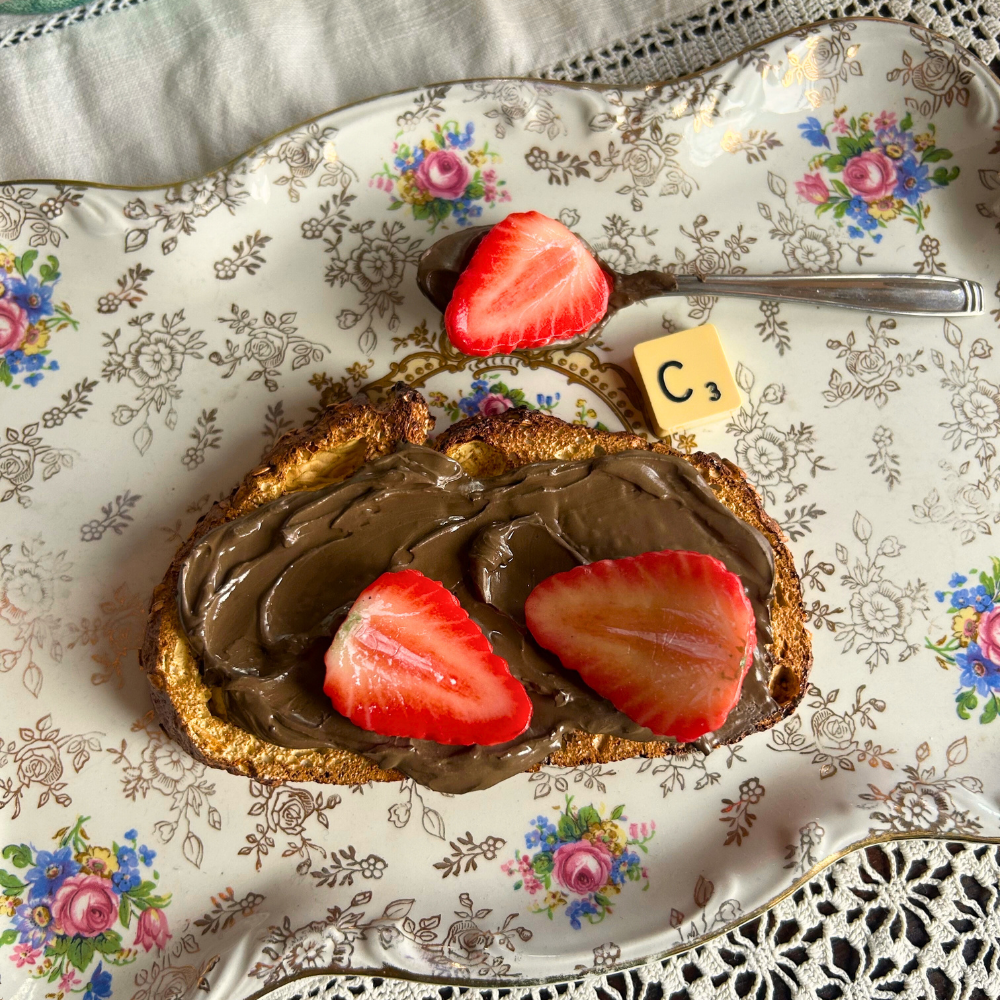 A faithful replica of a classic breakfast favourite: toasted bread with a generous layer of chocolate spread. Choose from strawberries, bananas, or plain Nutella — each slice is unique and arranged with care, as if moments away from being gobbled up. These sculpted pieces celebrate the simple pleasure of a morning snack, offering sweetness without ever growing stale. Perfect for the Nutella addict - We all know one!