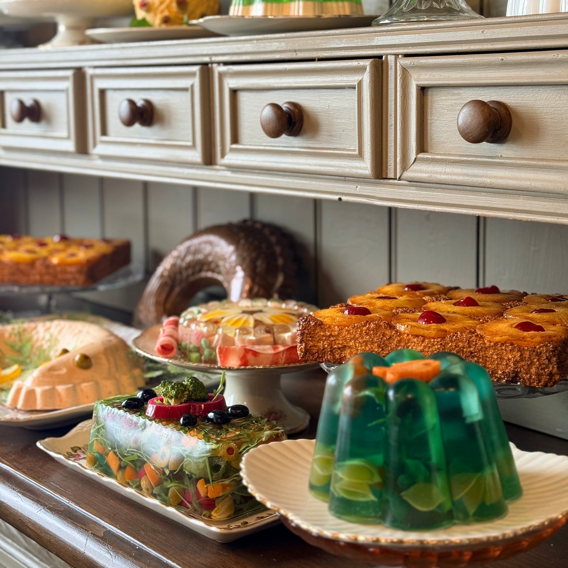 This sculpted loaf shaped perfection salad reflects the formal spectacle of mid-century table presentation, when elaborate jellied dishes were arranged as centrepieces rather than accompaniments. Set in clear aspic, this loaf shape features rolled ham, stuffed olives, carrot, cucumber, green beans, cabbage and perfectly finished with a 1950s carved fish carrot.