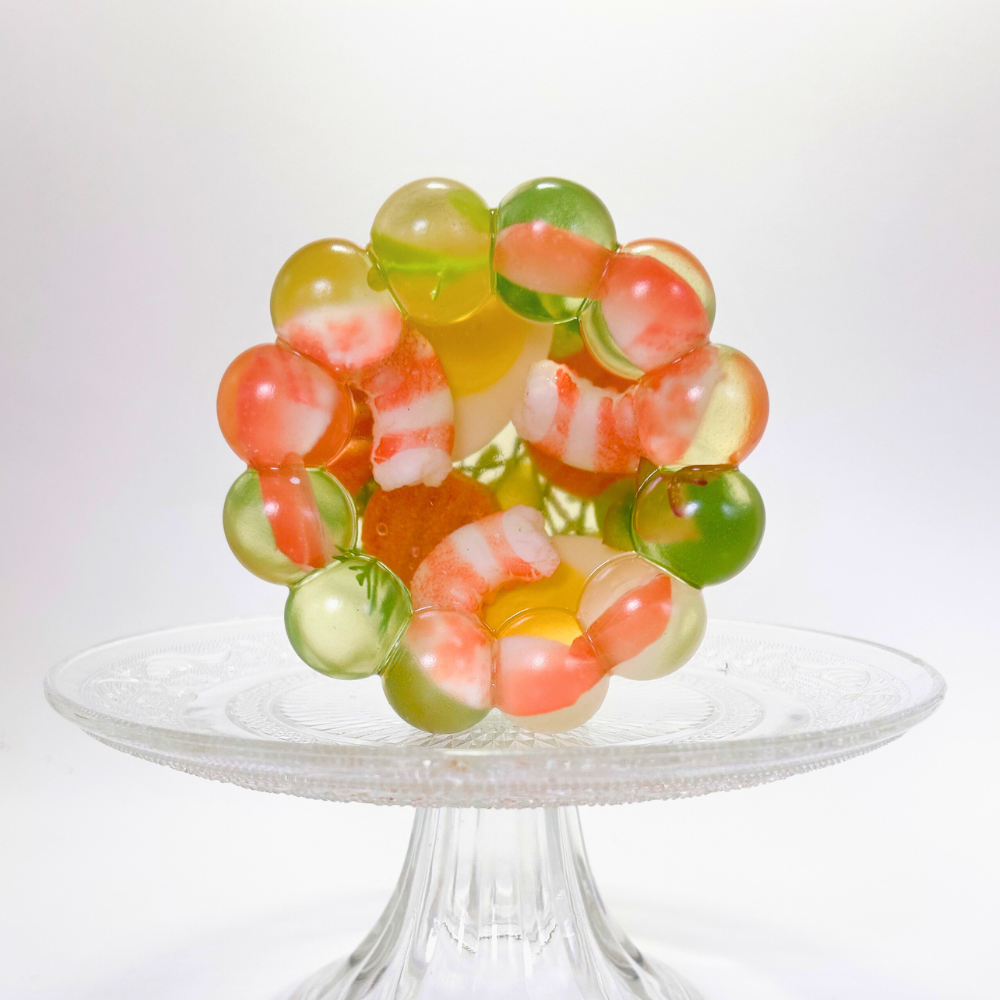 This sculpted savoury aspic salad is a faithful homage to mid-century entertaining, when jellied dishes held court at formal luncheons and hotel buffets. Cast in clear, glass-like aspic, the piece reveals a meticulous arrangement of replica prawns, sliced egg, carrot, cabbage, pasta and herbs, suspended as if freshly set.