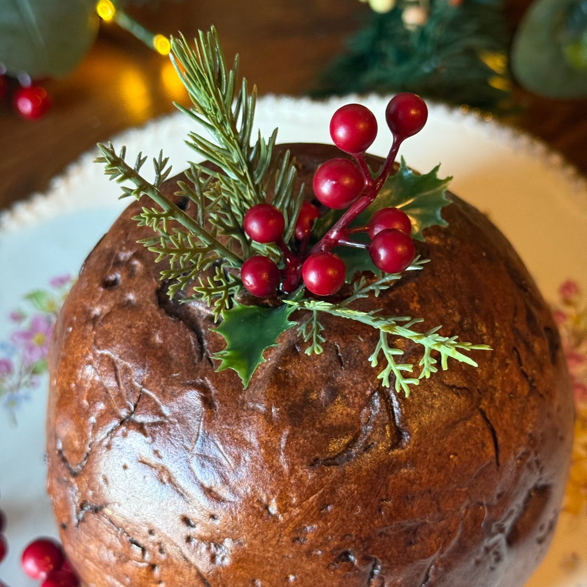 Hand-finished at every stage, this traditional basin-style Christmas pudding is sculpted in small batches in our workshop in Kirkcudbright, Scotland. Each piece is shaped and detailed by hand, capturing the rounded form, textured surface and fruit-studded character of a classic festive pudding. The finish is completed with seasonal greenery and berries, giving the familiar flourish seen on heritage Christmas tables.